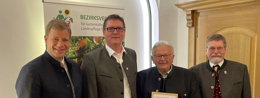 Bezirkstagspräsident Dr. Olaf Heinrich (v.l.) mit dem neuen Bezirksvorsitzenden Harald Hillebrand, seinem Vorgänger Michael Weidner und dem Präsidenten des Landesverbandes für Gartenbau und Landschaftspflege, Wolfram Vaitl. Foto: Bezirk Niederbayern, Manuela Lang