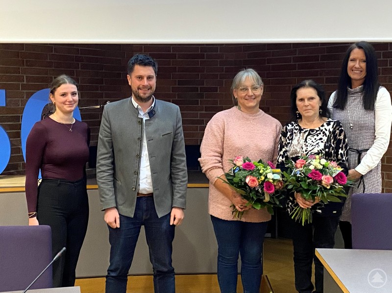 Emma Winklmeier (Sachgruppe Kindertagesbetreuung am Landratsamt), Stellvertretender Landrat Andreas Aichinger, die Geehrten Andrea Fränkel und Elisabeth Zitzelsberger und Claudia Riedl (Sachgruppe Kindertagesbetreuung am Landratsamt, von links).