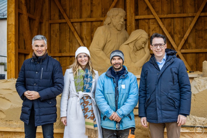 Deutschlands größte Sandkrippe wird im Jahr 2024 noch größer: v.r. Oberbürgermeister Dr. Christian Moser, Sandkünstler Jiří Kašpar, Lisa Peter vom Stadtmarketing und Stadtmarketing Vorstand Andreas Höhn