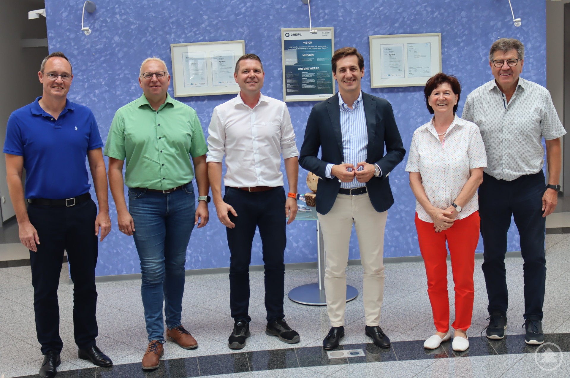 MdL Dr. Stefan Ebner (3. v. re.) wurde bei seinem Besuch am Hauptsitz der GREIPL-Unternehmensgruppe in Grafenau von Firmengründer Franz Greipl (1. v. re.), seiner Frau Paula (2. v. re.), Juniorchef Jürgen Greipl (3. v. li.), dem Kaufmännischen Leiter Christian Landstorfer (1. v. li.) und dem Geschäftsführer der der Technagon GmbH, Manuel Pledl (2. v. li.) willkommen geheißen.