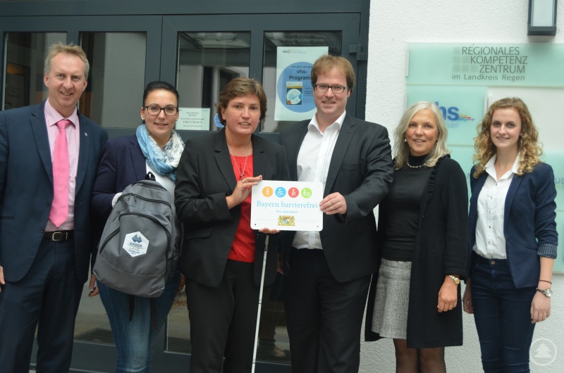 Irmgard Badura, Behindertenbeauftragte der Bayerischen Staatsregierung (3.v.l.), und Kreisbehindertenbeauftragter Helmut Plenk (1.v.l.) überreichten dem ARBERLAND REGio-GmbH-Team mit (v.l.) Veronika Neumaier, Regionalmanager Stephan Lang, Tourismusförderin Susanne Wagner, Teresa Kaiß das Signet „Bayern barrierefrei“.