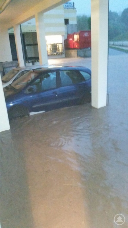 Das Foto zeigt einen überfluteten Parkplatz in Waldkirchen am Abend des 25.06.2016.