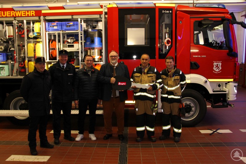 Oberbürgermeister Jürgen Dupper (3. von rechts) übergibt den symbolischen Schlüssel für das neue Löschgruppenfahrzeug an den 1. Kommandanten Herbert Dammer (2. von rechts), sehr zur Freude von (von rechts) dem stellv. Kommandanten Thomas Plettl, Ordnungsamtsleiter Erik Linseisen, Stadtbrandrat