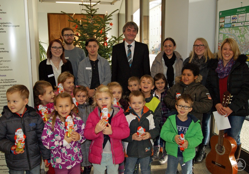 Der Leiter der Agentur für Arbeit Passau, Dr. Klaus Stein, bedankte sich bei den Kindern und Erzieherinnen des Kindergartens sowie bei seinen Mitarbeitern für die Unterstützung und Durchführung der Aktion und wünschte allen Beteiligten eine schöne Adventszeit: „Durch diese Aktion wird unseren Besuchern und Mitarbeitern gerade während der Weihnachtszeit ein herzlicher und farbenfroher Empfang bereitet und gleichzeitig der Kindergarten unterstützt.“ Zum Dank erhielt jedes der Kinder einen Schokonikolaus.