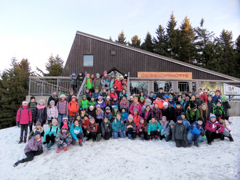 Eine Wanderung zum schneebedeckten Gipfel des Geißkopfs bei herrlicher Wintersonne bescherte den Kindern und Lehrern eine atemberaubende Fernsicht über das Nebelmeer des Bayerischen Waldes bis weit in die Alpen hinein zum Dachsteinmassiv.