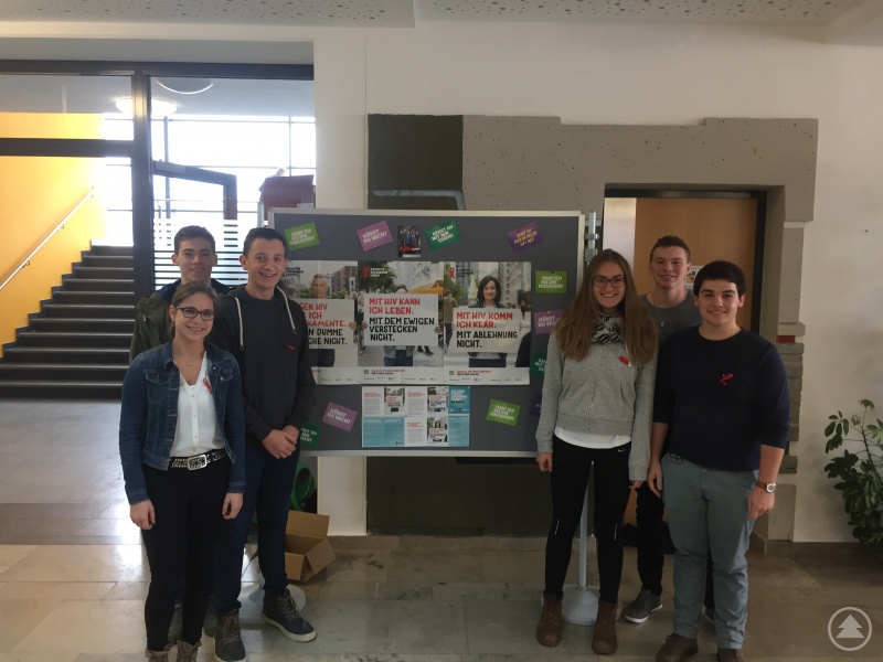 Begleitet wurden diese besonderen Biologiestunden durch eine von der Aktionsgruppe dargebotenen Ausstellung in der Aula. Jugendgemäß gestaltete Plakate weckten das Interesse an weiteren Themenschwerpunkten zu HIV/AIDS, aber auch zu anderen übertragbaren Krankheiten. Mit dem Verkauf der, von Gymnasiasten der Oberstufe gebastelten, roten Schleifen erzielte die engagierte Gruppe eine Spendensumme von 201 Euro, die der AIDS-Stiftung zugutekommt.