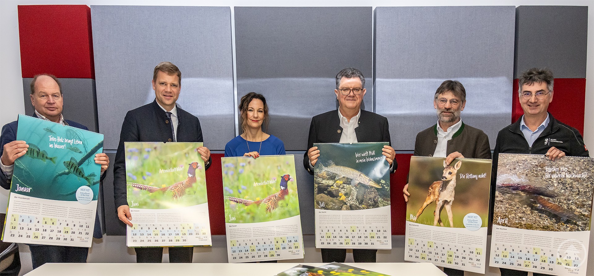 Zwölf Wildtierarten zeigt der Schulkalender „Wald, Wild und Wasser“ für 2025. Zur Vorstellung der 35. Auflage des Kalenders begrüßte Bezirkstagspräsident Dr. Olaf Heinrich Nicola Holzapfel, Leiterin des Sachgebiets „Grund- und Mittelschulen – Personal, Organisation“ der Regierung von Niederbayern, Michael Kreiner, Präsident des Fischereiverbandes Niederbayern, Dr. Manfred Forster vom Angelsportverein Landshut, Josef Weig, Bayerischer Jagdverband – Kreisgruppe Landshut, und Dr. Stephan Paintner, Leiter der Fachberatung für Fischerei des Bezirks Niederbayern.