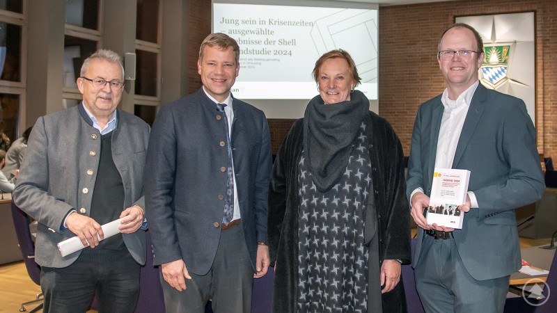 Bei der Vorstellung der Shell Jugendstudie 2024 in Straubing (v.l.) Landrat Josef Laumer, Bezirkstagspräsident Dr. Olaf Heinrich, Bezirksjugendring-Geschäftsführerin Anne Waechter und Referent Ingo Leven.