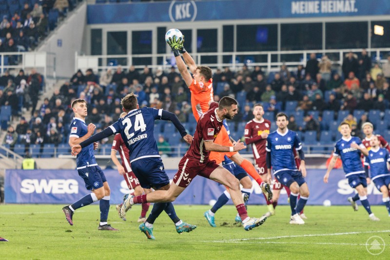 Die zweite Hälfte begann mit einer Schrecksekunde. Bereits nach wenigen Sekunden zog Zivzivadze in den Regensburger Strafraum und ging im Zweikampf mit Hein zu Boden. Schiedsrichter Prigan war sich erneut sofort sicher und zeigte auf den Punkt. Zivzvadze trat selbst an und scheiterte an Gebhardt (47.). Fast im Gegenzug setzte sich Hein über links durch und legte den Ball in die Mitte. Am kurzen Eck stand Eric Hottmann bereit und traf aus fünf Metern zur erneuten Führung (49.). Danach entwickelte sich ein offener Schlagabtausch. Prigan verwehrte erst Huth einen Elfmeter, zeigte dann aber im Regensburger Strafraum abermals auf den Punkt, nachdem Schleusener im Laufduell mit Bulic zu Boden gegangen war. Diesmal trat Wanitzek an und verwandelte sicher zum 2:2 (56.). Doch das Spiel blieb wild, nach einem starken Angriff scheiterte Huth am stark parierenden Weiß (58.). Aus dem hohen Pressing des Jahn konnte sich der KSC dann lösen, schnell ging es auf Zivzivadze, der die hoch aufgerückten Regensburger stehen ließ und eiskalt zum 3:2 traf (63.). Danach beruhigte sich das Spiel etwas, Weiß hielt den nächsten wuchtigen Abschluss von Hottmann sicher fest (73.). Der KSC kam aber nochmal über die linke Seite, der eingewechselte Luca Pfeiffer setzte sich durch und fand in der Mitte Schleusener, der zur Entscheidung zum 4:2 traf (86.). Der zweite Durchgang begann als offener Schlagabtausch. Bereits nach elf Sekunden zeigte Schiedsrichter Prigan auf den Elfmeterpunkt, doch Zivzivadze vergab gegen Gebhardt. Im Gegenzug verwertete Hottmann eine Hereingabe von Hein zur erneuten Führung. Doch diese hielt nicht lange, nach einem langen Ball und Kontakt von Bulic gab Prigan erneut Strafstoß, Wanitzek machte es diesmal besser als Zivzivadze zuvor und traf zum Ausgleich. Doch auch dieser hielt nicht lange, nach einem erneuten langen Ball war Gebhardt gegen Zivzivadze chancenlos und der KSC ging mit 3:2 in Führung. In einem spektakulären Spiel machte Schleusener mit dem 4:2 dann spät den Deckel drauf. Am Ende konnte sich der Jahn für über weite Strecken gutes Spiel abermals nicht belohnen. Am kommenden Sonntag trifft der Jahn im letzten Hinrundenspiel im Jahnstadion Regensburg auf Darmstadt 98. Anstoß ist um 13.30 Uhr.