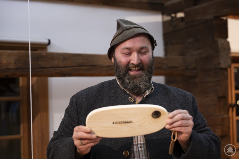 Neben einer Ehrenurkunde der Marktgemeinde Bodenmais erhielt „Woid Woife“ von Bürgermeister Adam und Tourismus-Chef Wolf ein „echt bomoas“-Brotzeitbrett überreicht, dass Gemeinderat und Messerschmied Stefan Tremml in Handarbeit angefertigt hat. Dieses Brett beinhaltet Moos, Flechten und Zapfenstücke, die mit Epoxidharz eingegossen wurden und symbolisiert somit „Woid Woifes“ große Verbundenheit zu „seinem“ Wald.