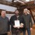 Bürgermeister Michael Adam (l.) und Tourismus-Chef Tobias Wolf (r.) bedankten sich bei Wolfgang Schreil alias „Woid Woife“ mit einer Ehrenurkunde und einem handgemachten Brotzeitbrett.