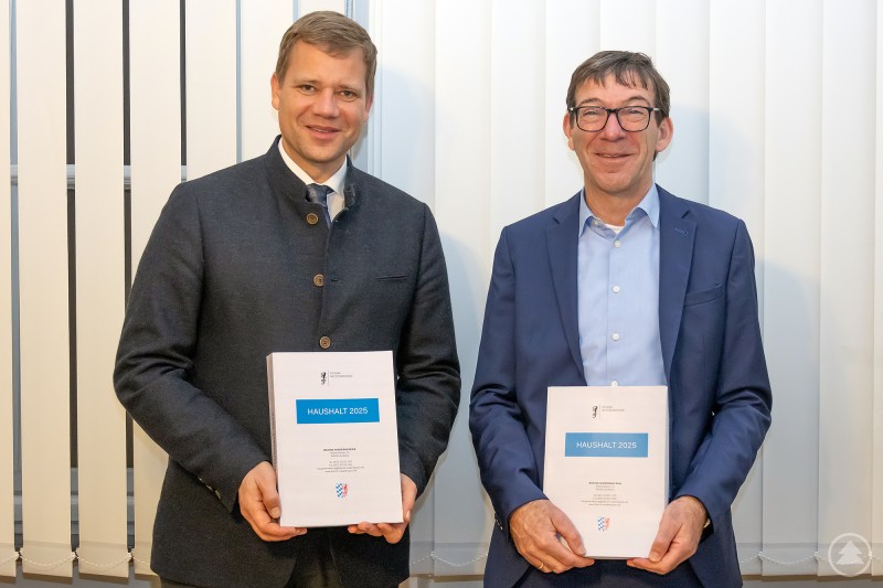 Bezirkstagspräsident Dr. Olaf Heinrich und Bezirkskämmerer Winfried Amler (r.) mit dem Zahlenwerk zum Haushalt 2025.