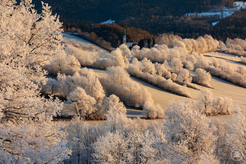 Die Aunahme zeigt einen Raureifmorgen zum Jahresende 2024 aus dem Graineter Tal ... eine märchenhafte Landschaft mit Büschen, Sträuchern und Bäumen in Kristall auf naturbelassenen Feldrainen mit der Pfarrkirche.
