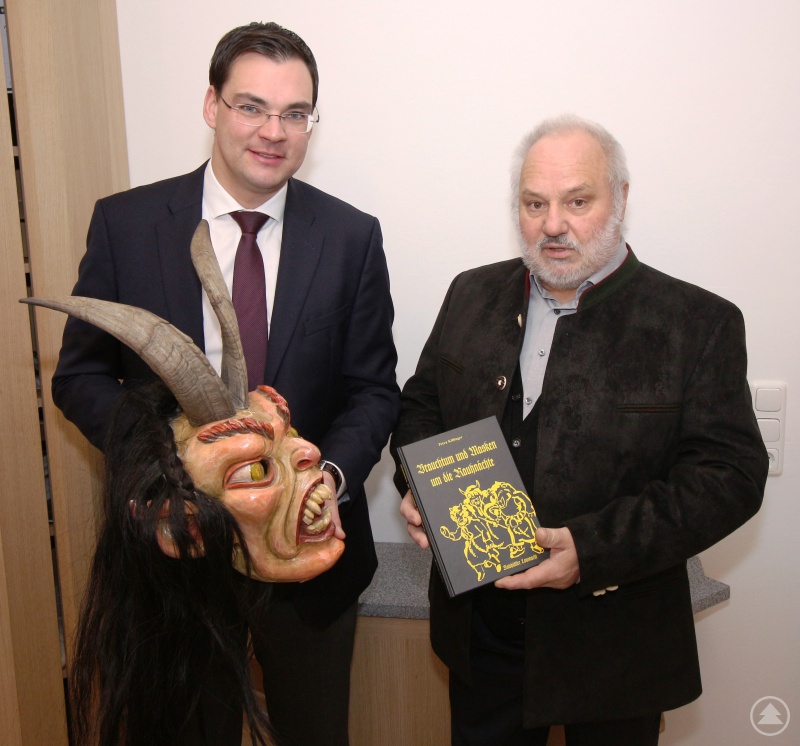Hans Blöchinger überreicht Sebastian Gruber das neu erschienene Buch, nachdem er zuvor dem Landrat die Maske des „Lusendeifi“ zeigen konnte.