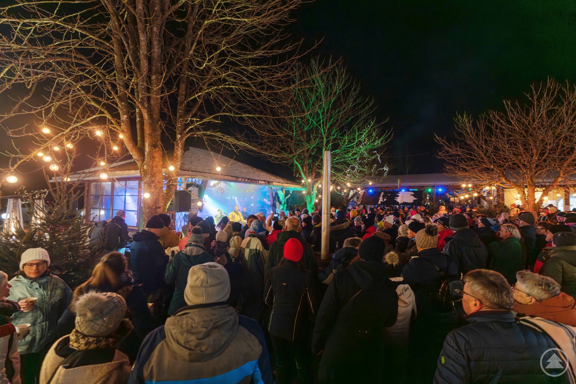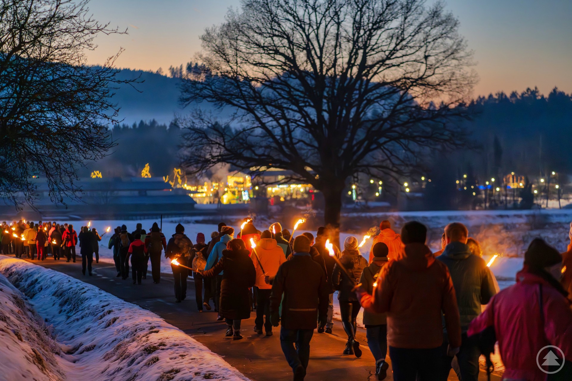 Nach der Eröffnungsfeier beim Dorfwirt in Arnbruck am Mittwoch fand der 6. Deutsche Winterwandertag ein gebührendes Finale bei einer großen Winterparty am Samstag im JOSKA Glasparadies in Bodenmais mit der Partyband „Saxndi“. Dazu wurde sich um 17 Uhr am Rathaus in Bodenmais getroffen, um mit Fackeln ins Partygelände zu ziehen. Die Bürgermeister der ausrichtenden Gemeinden, Angelika Leitermann (Arnbruck), Michael Englram (Langdorf), Johannes Vogl (Drachselsried) und Michael Adam (Bodenmais), marschierten gemeinsam mit den Wanderführern und Tourist-Info-Mitarbeiterinnen und -Mitarbeitern sowie rund 100 Winterwanderern ins Glasparadies. Außerdem wurde mit Zellertal-Reisen ein Busshuttle aus den vier Gemeinden eingerichtet.