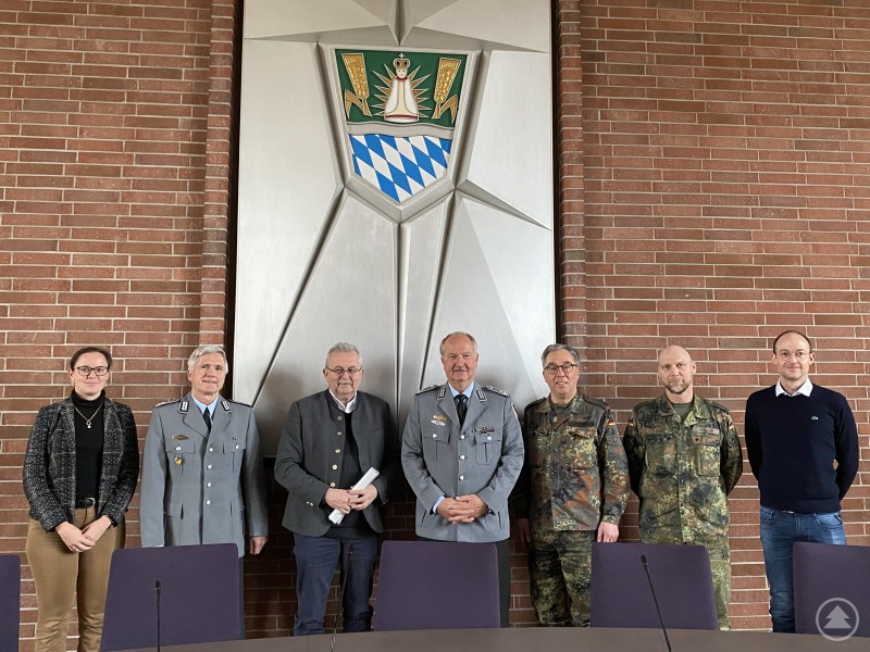 Regierungsdirektorin Stephanie Aumer, Oberstleutnant Andreas Piening, Landrat Josef Laumer, Oberstleutnant Rudolf Schmitzer, Oberstleutnant Claus Schorn, Oberstleutnant Volker Müller und Dominik Bachl (Katastrophenschutz Landratsamt, von links) bei der Verabschiedung im Landratsamt.