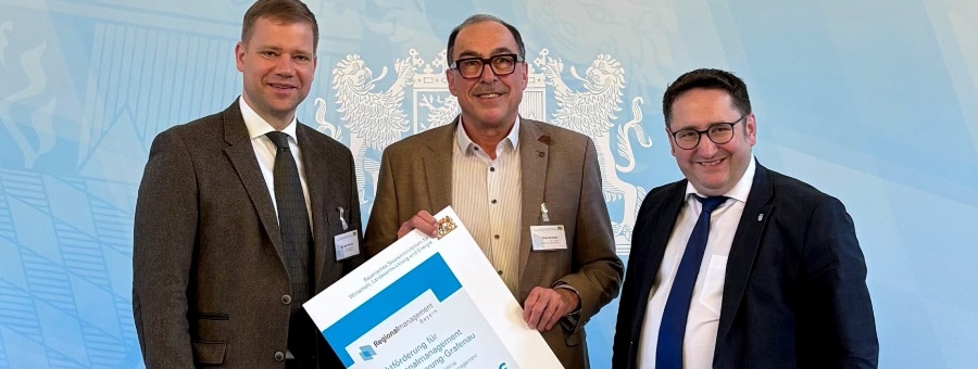 Der Landkreis Freyung-Grafenau wird auch in den kommenden drei Jahren für die Arbeit seines Regionalmanagements über den Freistaat Bayern gefördert. Der zuständige Staatssekretär im Bayerischen Staatsministerium für Wirtschaft, Landesentwicklung und Energie, Tobias Gotthardt, hat dem Stellvertretenden Landrat Franz Brunner und Regionalmanager Stefan Schuster den Förderbescheid über knapp 750.000 Euro überreicht. Damit wird die regionale Initiative in den nächsten drei Jahren insgesamt fünf Projekte in den Bereich Fachkräfte, Berufsorientierung, regionale Identität sowie Konversion voranbringen. „Wir freuen uns über die weitere Zusage der Fördermittel, das Vertrauen und die bewährte, zukunftsweisende sowie professionelle Umsetzung spannender Projekte und Kooperationen in unserem Regionalmanagement-Team um Stefan Schuster. Die Konstanz in diesem Bereich hat sich absolut bewährt“, äußerte sich Stellvertretender Landrat Franz Brunner erfreut über den Förderbescheid.