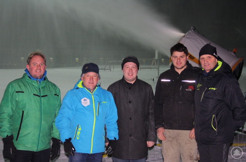Im Rahmen der ersten nächtlichen Beschneiung erklärte Thomas Liebl, Betriebsleiter der ARBER Bergbahn, den sachgemäßen und gefahrenfreien Umgang mit den neuen Schneekanonen. Um für die anstehenden Wintersportevents gerüstet zu sein, sind trotz günstiger Naturschneeaussichten einige Nachtschichten an den Maschinen nötig. Bei dieser Gelegenheit dankte Landrat Adam allen beteiligten Leistungsträgern, dem Fürstenhaus Hohenzollern, dem Bayerischen Skiverband, den Landkreisen Cham und Regen, den umliegenden Kommunen, der ARBERLAND Betriebs-gGmbH und den vielen Sponsoren und Ehrenamtlichen. „Insbesondere den LLZ-Förderverein und seine Vorstandschaft möchte ich hier hervorheben. Diese verantworten seit Jahren Millionenerweiterungen und -umbauten. Sie aquirierten viele Hunderttausende Euro an öffentlichen Zuschüssen, Spenden und Sponsoring. Besonderer Dank gilt auch der Firma Streicher, die sich immer wieder finanziell bei Planungen und Baumaßnahmen einbringt.“