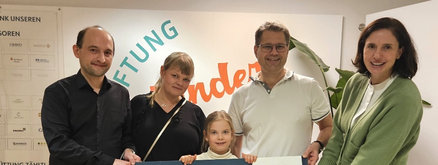 (v. l.) Alexander Moser und Lebensgefährtin Nora Szekeres mit Tochter Lili, Kinderklinik-Chefarzt Prof. Dr. Matthias Keller und die Stiftungsvorstandsvorsitzende Dr. Maria Diekmann. (Foto: Stefanie Starke)