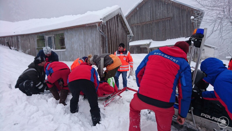 Matthias Stockbauer und Maria Wittensöllner, die privat in der Nähe waren, machten sich sofort auf den Weg zum Unfallort, während die Bergretter Thomas Mixa, Dr. Bodo Strößenreuther und Anton Schmeller in Rekordzeit das Einsatzfahrzeug samt Akja und Motorschlitten zur Abfahrt bereit machten und starteten.