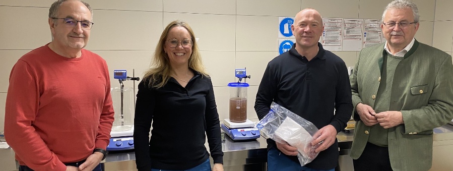 Martin Sansoni (Leiter Veterinäramt), Kerstin Jaretzke (Veterinäramt), Martin Kraus (Veterinäramt) und Landrat Josef Laumer (von links) in der neuen Trichinenuntersuchungsstelle.