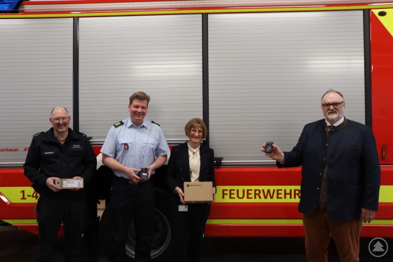 Die Alarmierung der Feuerwehren der Stadt Passau wird digital. In den nächsten Tagen werden die neuen Pager an die städtischen Feuerwehren ausgeliefert und auf Tetra-Digitalfunk umgestellt. Oberbürgermeister Jürgen Dupper übergab nun das erste Gerät an Stadtbrandrat Andreas Dittlmann im Beisein von Ordnungsreferentin Karin Schmeller und dem Wachführer der Hauptamtlichen Tagwache Alexander Kornexl.