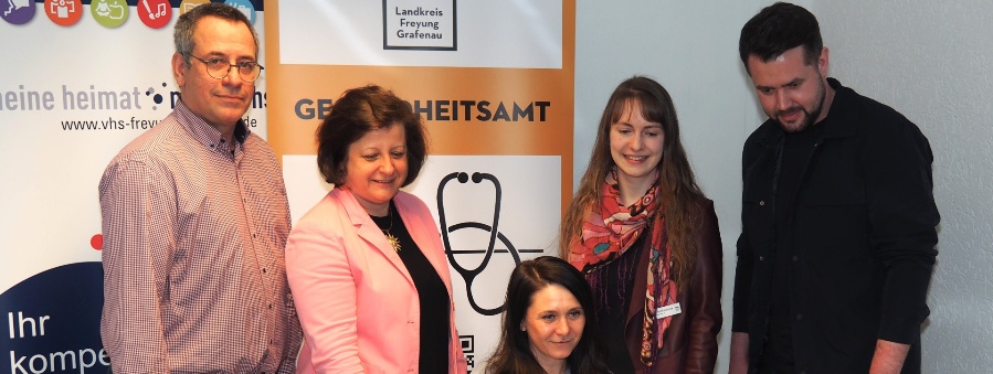 Sprachen, vhs-Geschäftsführerin Dr. Karina Fisch (sitzend), Dr. Karin Drachsler, Fachbereichsleitung des Kinder- und Jugendärztlichen Dienstes am Gesundheitsamt und Christopher Kessel (Gesundheitsamt).