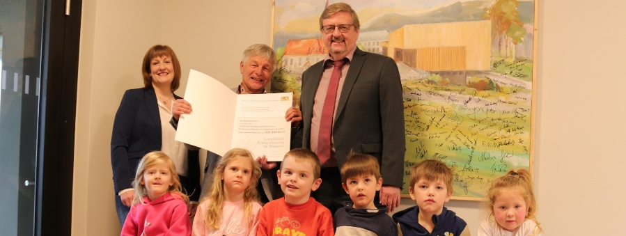 Im Beisein von Kindergartenkindern überreichte ALE-Leiter Hans-Peter Schmucker (r.) an Röhrnbachs ersten Bürgermeister Leo Meier (Mitte) und Kämmerin Stefanie Graf-Riedl ein weiteres Förderpaket über 500.000 Euro für das Dorfgemeinschaftshaus mit Bürgerhalle.