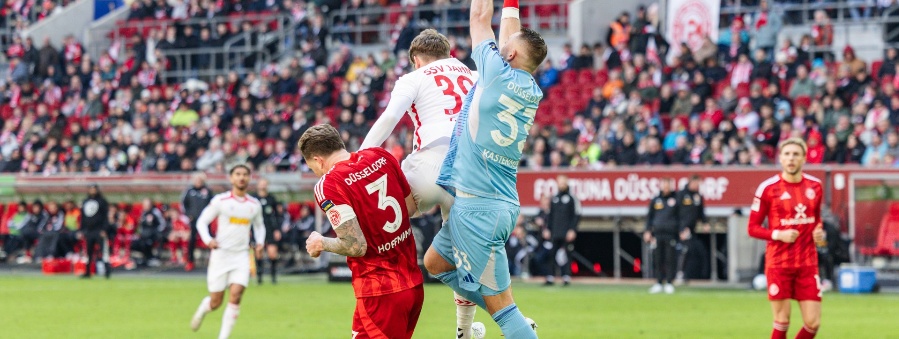 Chef-Trainer Andi Patz nahm zwei Veränderungen in der Startelf vor: Nach dem 0:0 gegen Paderborn vergangene Woche erhielten Annsi Suhonen und Noah Ganaus Startelfmandate, Sebastian Ernst und Eric Hottmann nahmen erst einmal auf der Bank Platz. Ganaus wagte auch die erste Torannäherung und marschierte auf der rechten Seite Richtung Strafraum, aber seine flache Hereingabe trudelte ins Toraus (3.). Die Fortuna tat sich in diesen Anfangsminuten zunächst schwer. Nach einem langen Schlag eilte Fortuna-Keeper Kastenmeier aus dem Kasten und war per Kopf gerade noch vor Adamyan zur Stelle (6.). Auf der Gegenseite verzeichnete Zimmermann den ersten Torschuss für die Fortuna. Zimmermanns Distanzschuss stellte Julian Pollersbeck aber vor keine größeren Probleme (11.). Der SSV zeigte sich ebenfalls mutig: Suhonen chippte den Ball aus dem Halbfeld an den langen Pfosten, wo Adamyan per Direktabnahme ans Außennetz setzte (14.). Die Gastgeber probierten sich bisher an Fernschüssen: Der Versuch von Iyoha landete aber ebenfalls in den Armen von Pollersbeck (18.). Die Jahnelf aber bot den Fortunen bisher viel Paroli und hatte selber durch Ganaus die nächste Möglichkeit: Der Jahn Angreifer zog von links in den Strafraum und schlenzte den haarscharf am Pfosten vorbei (24.). Auch in den folgenden Minuten hatte der SSV eine Tick mehr vom Spiel und hielt Düsseldorf vom eigenen Tor fern. Noch zwingendere Chancen konnte sich die Mannschaft von Chef-Trainer Andi Patz aber nicht herausspielen. Wenn es bei Düsseldorf gefährlich wurde, dann über einen Tempogegenstoß: Nach einer weiteren schnellen Seitenverlagerung dribbelte erneut Iyoha auf die Jahn Abwehr zu, aber sein Abschluss zischte doch zwei, drei Meter am Tor vorbei (32.). Auch der Drehschuss von Kownacki im Strafraum war mehr ein Kullerball in Richtung Pollersbeck (35.). Drei Minute später machte er es besser: Die Jahnelf bekam eine Flanke von rechts nicht geklärt, Kownacki schnappte sich die Kugel und zog ab - knapp vorbei (38.). Die Halbzeitpause rückte näher - und die Fortuna wurde immer stärker. Breunig konnte eine Kontersituation gerade noch entschärfen (40.). Nach der folgenden Ecke war es dann aber passiert: Pollersbeck flog am Ball vorbei und brachte diesen mit den Fingerspitzen nicht weit genug aus der Gefahrenzone raus - Oberdorf lauerte dahinter und jagte den Ball mit einem strammen Schuss in Richtung Jahn Tor, Zimmermann bugsierte den Ball aus kurzer Distanz über die Linie zum 1:0 für die Hausherren (41.). Beinahe die direkte Antwort: Adamyan legte im Düsseldorfer Strafraum in den Lauf von Suhonen, der allerdings nicht zum Abschluss kam (42.). Auf der anderen Seite hätte aber auch Vermeji auf 2:0 erhöhen können, scheiterte aber mit seinem Schuss an Pollersbecks Fäusten (45.). Dann war in der Düsseldorfer Merkur-Spiel Arena Halbzeit.