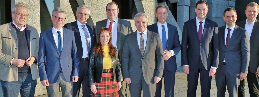Bezirkstagspräsident Dr. Olaf Heinrich, Landrat Raimund Kneidinger (Passau), Landräte-Sprecher Sebastian Gruber (Freyung-Grafenau), Regierungspräsident Rainer Haselbeck, Landrat Peter Dreier (Landshut), Landrat Michael Fahmüller (Rottal-Inn), Andrea Degl (Geschäftsführendes Präsidialmitglied des Bayerischen Landkreistages), Landrat Werner Bumeder (Dingolfing-Landau), Landrat Bernd Sibler (Deggendorf) und Landrat Josef Laumer (Straubing-Bogen).