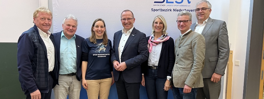 v.l.n.r.: Stellv. BLSV Bezirksvorsitzender u. Kreisvorsitzender des Sportkreises Passau Walter Knoller, BLSV Bezirksvorsitzender u. Kreisvorsitzender des Sportkreises Deggendorf Otto Baumann, Stellv. BLSV Kreisvorsitzende Linda Zeindl, BLSV Präsident Jörg Ammon, 3 .Bürgermeisterin der Stadt Deggendorf und Bezirksrätin Renate Wasmeier, der Deggendorfer Landrat Bernd Sibler und BLSV Verbandsbeiratsvorsitzender Dieter Bunsen