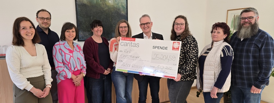 Rekord bei der Caritas: Mitarbeiter:innen der Caritas spendeten bei „Restcent-Aktion“ über 25.000 Euro. Sie fördern damit Ausbildungsplätze in fünf Einrichtungen. Am Donnerstag, 10. April hat Caritasvorstand Stefan Seiderer die Schecks in Höhe von 5.040,32 Euro überreicht.