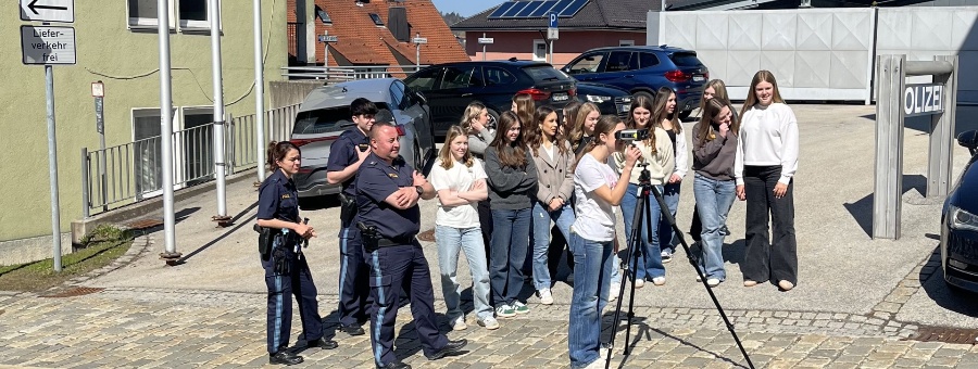 Unter Aufsicht des Verkehrsspezialisten der PI Freyung POK Christian Moosbauer sowie POW Marina Blöchl und POW Alexander Weiß konnten die Schülerinnen einen Blick durch die Kamera zur Geschwindigkeitsmessung werfen.