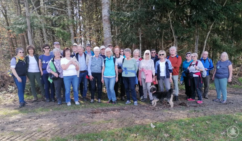 Eine große Gruppe älterer Wanderfreunde steht gut gelaunt am Waldrand. Die Personen sind sportlich gekleidet und teilweise mit Rucksäcken und Wanderstöcken ausgerüstet. Die Szene spielt sich an einem sonnigen Tag ab – vermutlich während einer geführten Wanderung.