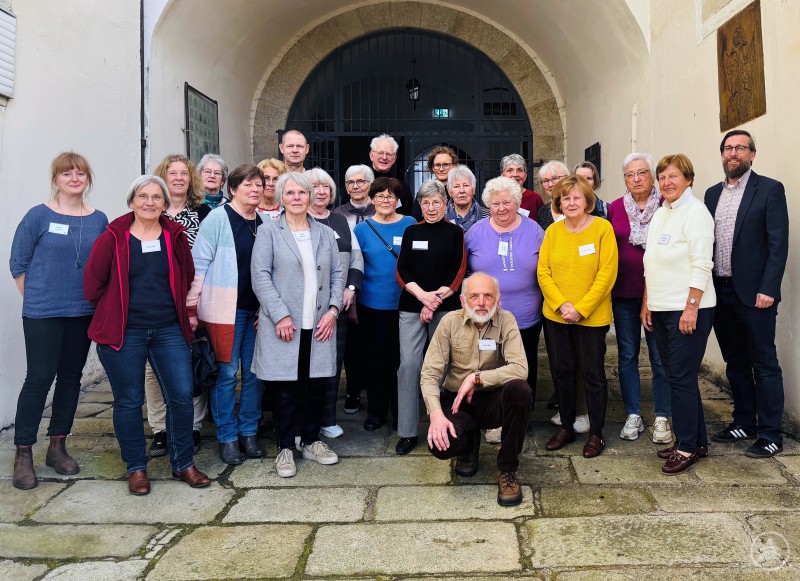 Eine größere Gruppe von Menschen steht in einem historischen Innenhof vor einem Torbogen. Die Teilnehmenden, darunter überwiegend Frauen im mittleren bis höheren Alter, tragen Namensschilder. Es handelt sich vermutlich um ein Vernetzungs- oder Austauschtreffen im Bereich Ehrenamt, Sprachförderung oder Integration. Die Stimmung wirkt gemeinschaftlich und engagiert.