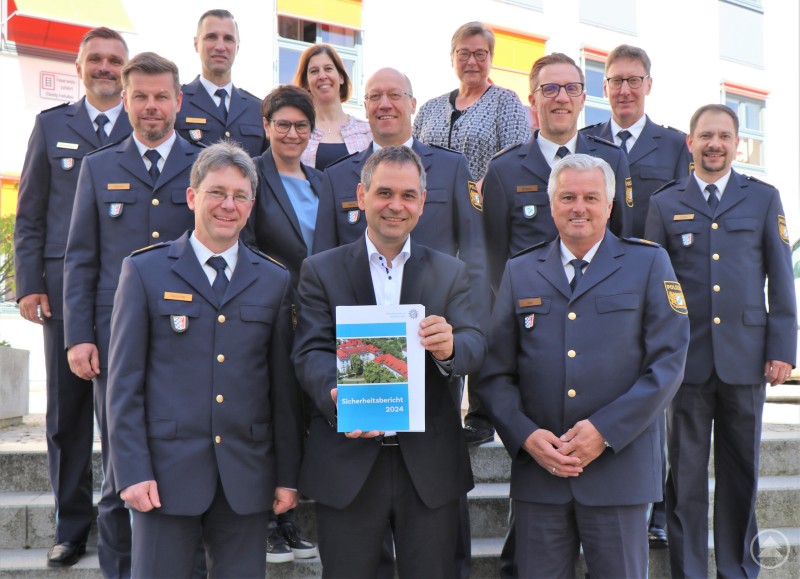 Polizeipräsident Roland Kerscher (vorne links), Polizeivizepräsident Werner Sika (vorne rechts) und Landrat Raimund Kneidinger (mittig) präsentieren gemeinsam mit weiteren Führungskräften der Polizei den Sicherheitsbericht 2024.