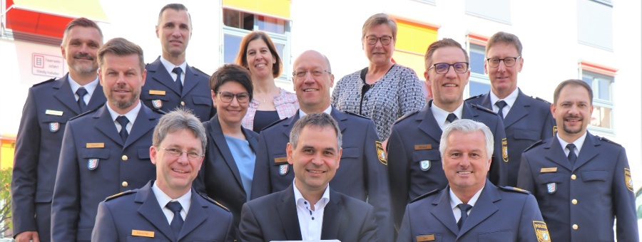 Polizeipräsident Roland Kerscher (vorne links), Polizeivizepräsident Werner Sika (vorne rechts) und Landrat Raimund Kneidinger (mittig) präsentieren gemeinsam mit weiteren Führungskräften der Polizei den Sicherheitsbericht 2024.