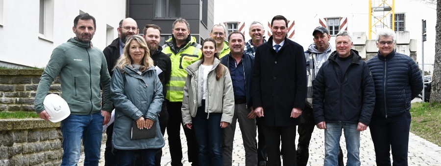 Bei einem Ortstermin mit Vertretern von Kreisverwaltung, Planungsbüro und Baufirma freute man sich darüber, dass man mit dem Aufbau des Wartungsstegs den Startschuss für die Sanierungsarbeiten an Schloss Wolfstein geben kann (von links): Sachgebietsleiter Reinhard Tolksdorf (LRA), Planer Thomas Graßl (Planungsbüro Graßl), Architektin Susanne Bauer (LRA), Benedikt Graßl (Planungsbüro Graßl), Projektleiter Josef Burghard (Pauli Metallbau), Isabella Pauli (Pauli Metallbau), Sebastian Fuchs (Pauli Metallbau), Firmenchef Hans Pauli (Pauli Metallbau), Ludwig Duschl (Haller Bau), Landrat Sebastian Gruber, Michael Haidl (Haller Bau), Firmenchef Rudolf Haller (Haller Bau), Abteilungsleiter Siegfried Wilhelm (LRA).