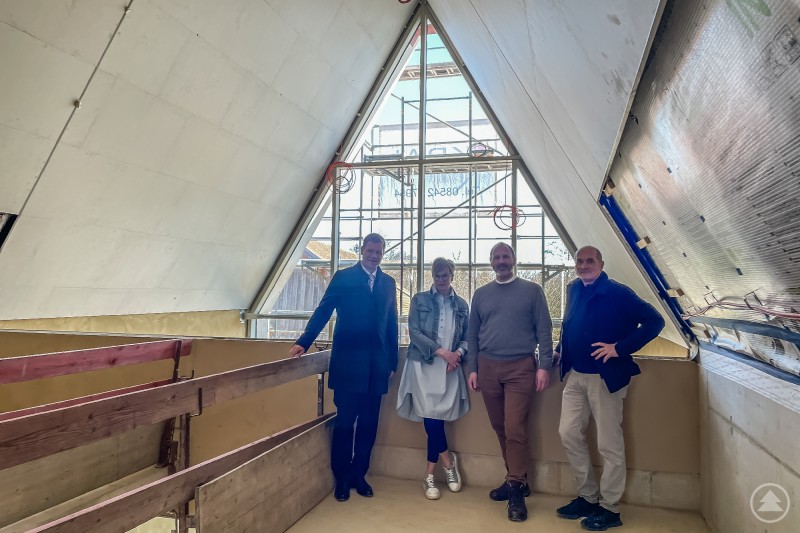 Vier Personen stehen im Rohbau eines Gebäudes mit einem markanten, dreieckigen Fenster im Hintergrund und einer sichtbaren Baustellenstruktur.