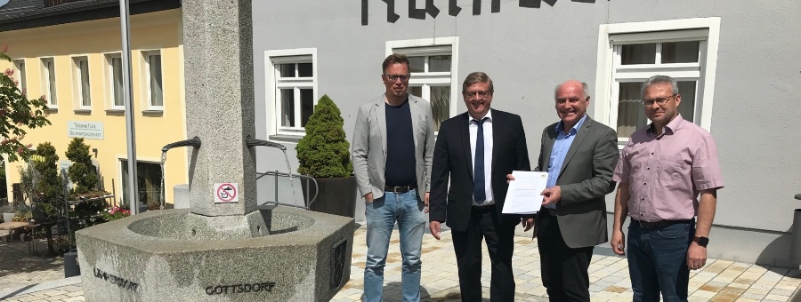 Übergabe des Beendigungsschreibens zur Dorferneuerung in Hundsruck: (v.l.) Geschäftsleiter Michael Graml, ALE-Leiter Hans-Peter Schmucker, Bürgermeister Hermann Duschl und Bauamtsleiter Hans-Peter Lang vor dem Rathaus.
