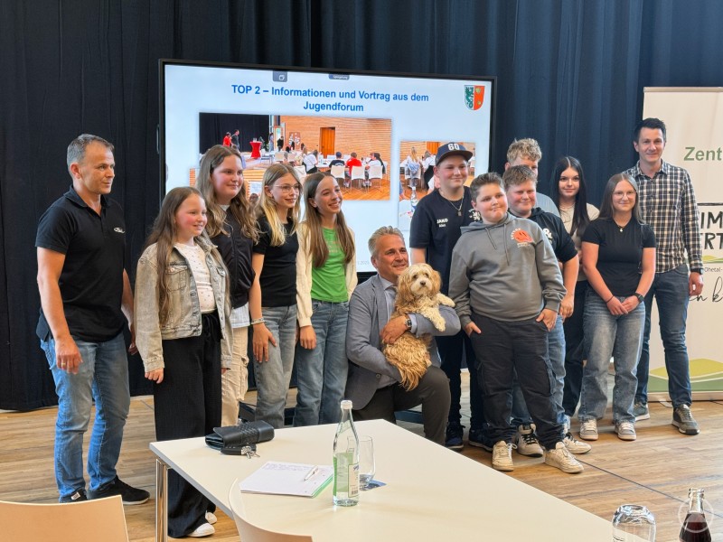 Gruppenfoto von Jugendlichen und Gemeinderatsmitgliedern vor einem Bildschirm mit Präsentationstitel, ein Mann hält einen kleinen Hund im Arm.