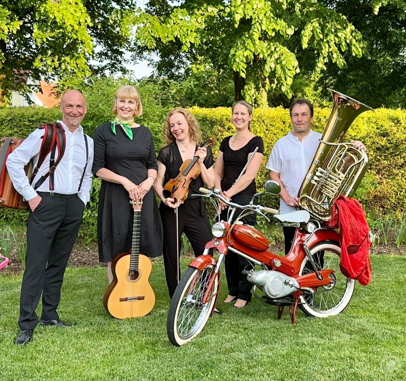Die Musikgruppe „Pomp-A-Dur“ tritt am 31. Mai 2025 beim Zwieseler Finkeneinstand im Freilichtmuseum Massing auf.