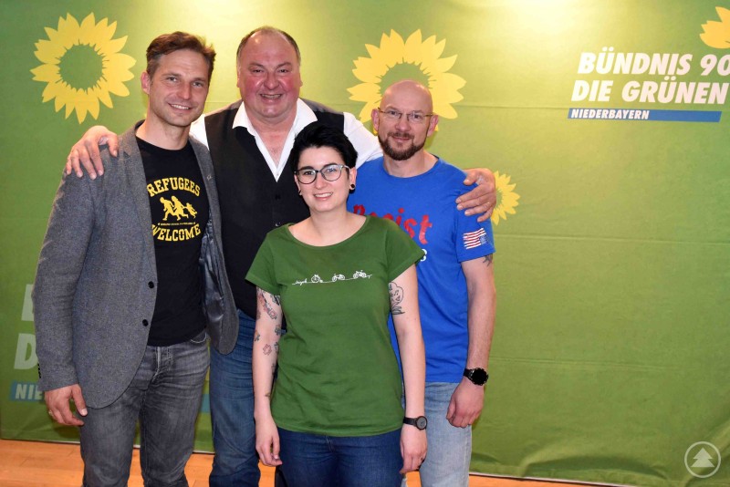 Vier Personen stehen vor einem grünen Hintergrund mit dem Logo und Schriftzug der Partei „BÜNDNIS 90/DIE GRÜNEN NIEDERBAYERN“. Zwei Männer stehen hinten, zwei Personen vorne – eine Frau in grünem T-Shirt und ein Mann in blauem T-Shirt. Die Gruppe wirkt freundlich und lächelnd.