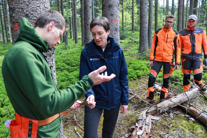 „Im vergangenen Jahr hat sich unsere Vorbereitung ausgezahlt“, betont Nationalparkleiterin Ursula Schuster. Während 2023 noch 144.100 Festmeter Käferholz anfielen, waren es 2024 nur noch 38.000 Festmeter. Ursachen dafür waren unter anderem ausreichende Niederschläge und eine damit verbesserte Widerstandskraft der Bäume. Auch die konsequente Suche nach befallenen Fichten trug maßgeblich zum Rückgang bei.