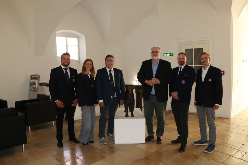 Sechs Personen, fünf in dunklen Anzügen mit Wasserwacht-Abzeichen, stehen gemeinsam mit Oberbürgermeister Jürgen Dupper in einem hellen Raum mit Tonnengewölbe. In der Mitte befindet sich eine Tier-Skulptur auf einem Podest.