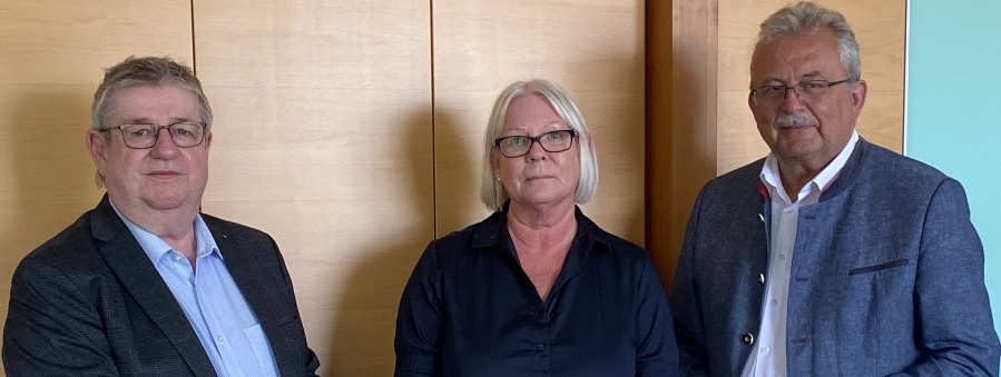 Dieter Hantke, Ulrike Schäfer und Landrat Josef Laumer (von links) bei der Übergabe der Urkunde im Büro des Landrats.