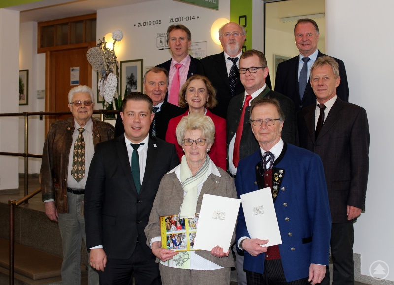Heidemarie Brückl (vorne 2.v.re.) und Helmut Jungbeck (vorne re.) bekamen von Landrat Michael Adam (vorne 3.v.re.) die Auszeichnung übereicht. Es gratulierten (v.li.) Peter Brückl, Hermann Brandl, Helmut Plenk, Ilse Oswald, Erich Muhr, Johann Hutter, Willi Killinger und Günther Arend.