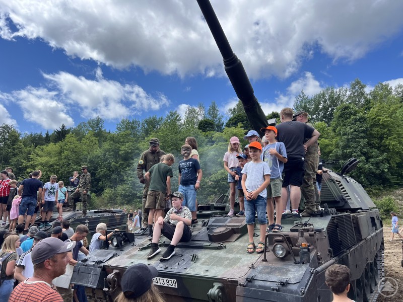 Schon beim Betreten der Kaserne wurden die Gäste von einer imposanten Reihe moderner Waffensysteme empfangen: Leopard 2, Puma, Marder, Leguan und Panzerhaubitze – bereit zur Besichtigung und als Auftakt zu den spektakulären dynamischen Vorführungen. Wer sich umsah, hatte die Qual der Wahl: Ninja-Parcours, Hindernisbahn, Feldschmiede, Traditionsuniformen oder Veteranenstand – überall wurde Mitmachen, Staunen und Lernen großgeschrieben.