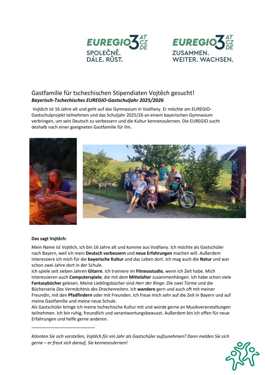 Vojtěch ist 16 Jahre alt, freundlich, hilfsbereit und spricht bereits gut Deutsch. Er hat ein Stipendium erhalten und möchte an einem Gymnasium in der Region seine Sprachkenntnisse verbessern und die bayerische Kultur erleben. Seine Hobbys sind Gitarre spielen, Lesen und Wandern in der Natur.