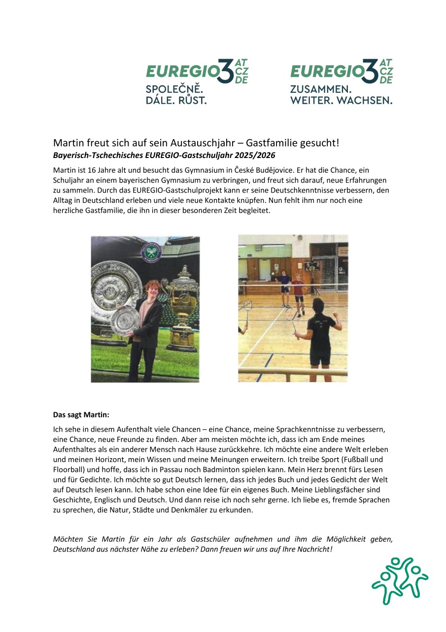 Für das Schuljahr 2025/2026 sucht die EUREGIO Bayerischer Wald – Böhmerwald – Unterer Inn engagierte Gastfamilien für tschechische Austauschschüler. Die Gymnasien in Freyung, Waldkirchen und Grafenau unterstützen das wertvolle Austauschprogramm mit großer Überzeugung – und freuen sich über jede Familie, die mitmacht.